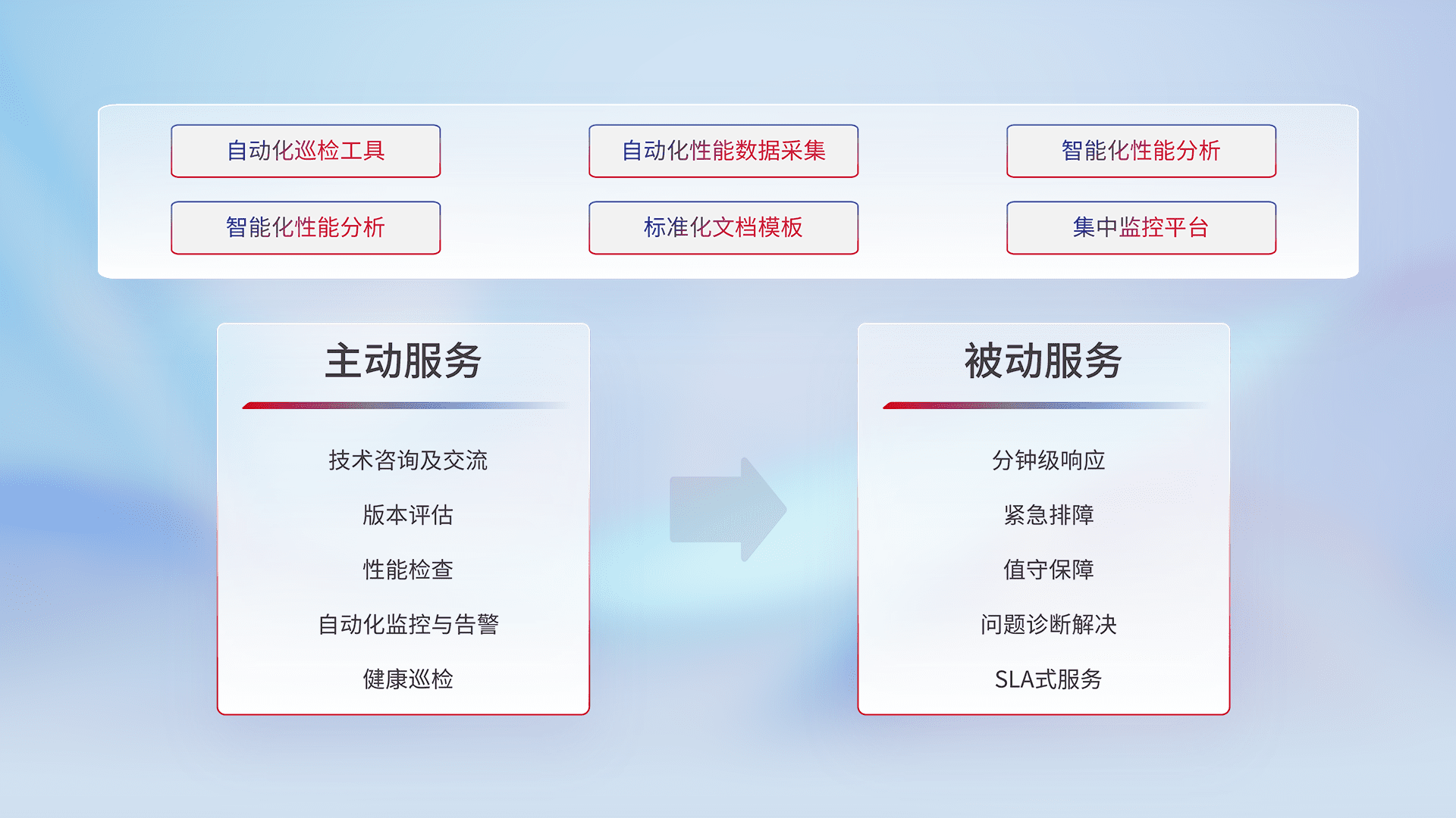 智能化工具和标准化文档,,保障服务质量,,,,提供主动服务(包含技术咨询、、版本评估、、性能检查、、、自动化监控与告警、、、、健康巡检)和被动服务包含(分钟级响应、、、、紧急排障、、值守保障、、、问题诊断解决、、、、SLA服务)。。。